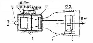 加工坦克發動機缸套的最后一道工序——珩磨工序的質量和精度要求較高,其中要求內孔尺寸精度IT6級,內孔圓度0.015mm,平行度0.03mm(由上道工序保證),表面粗糙度Ra0.05μm。采用傳統珩磨工藝加工時,產品質量不穩定,難以達到精度要求。為解決這一問題,筆者研制了直徑f150mm的超聲珩磨系統樣機,采用該珩磨機樣機的缸套試件可滿足加工技術要求。 1、樣機結構原理 本樣機是根據兵總616廠的生產要求立項預研的。樣機的超聲珩磨系統結構見圖。系統由超聲波發生器、頻率計、超聲珩磨裝置等組成。超聲珩磨裝置由聲振系統(換能器、變幅桿、工具聲振系統)、珩磨頭部、漲芯部、動力傳遞部、碳刷、浮動連接部、機殼部等組成,其工作原理是由超聲波發生器將50Hz交流電轉換為超聲頻的電振蕩,由換能器將超聲頻的電振蕩轉換為超聲頻的機械振動。由于該機械振動振幅較小,僅為4μm左右,不能直接用于機械加工,因此需要通過變幅桿將振幅放大,并將振動傳給聲振子系統,由聲振子系統帶動其上的油石產生縱向振動,從而實現在普通珩磨基礎上附加超聲振動的超聲振動珩磨加工。